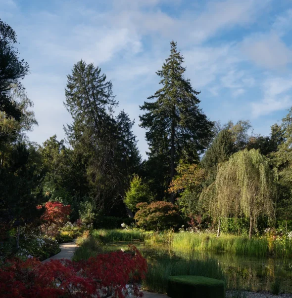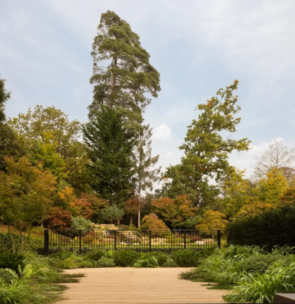 As Director Johnny Hood explains, “The design evolved from a desire to create a series of different external sensory experiences whilst walking through the garden. The Mediterranean garden elegantly accompanies the pool terrace, while the sky mirror water feature visually links the upper garden to the lower lake. Moreover, the layered arrival route carefully divides the journey into a clear approach, entrance, and moment of arrival. In addition, the Japanese garden introduces seasonal warmth in autumn, with a cascading feature that provides both colour and sound — a quiet retreat from daily life”.
